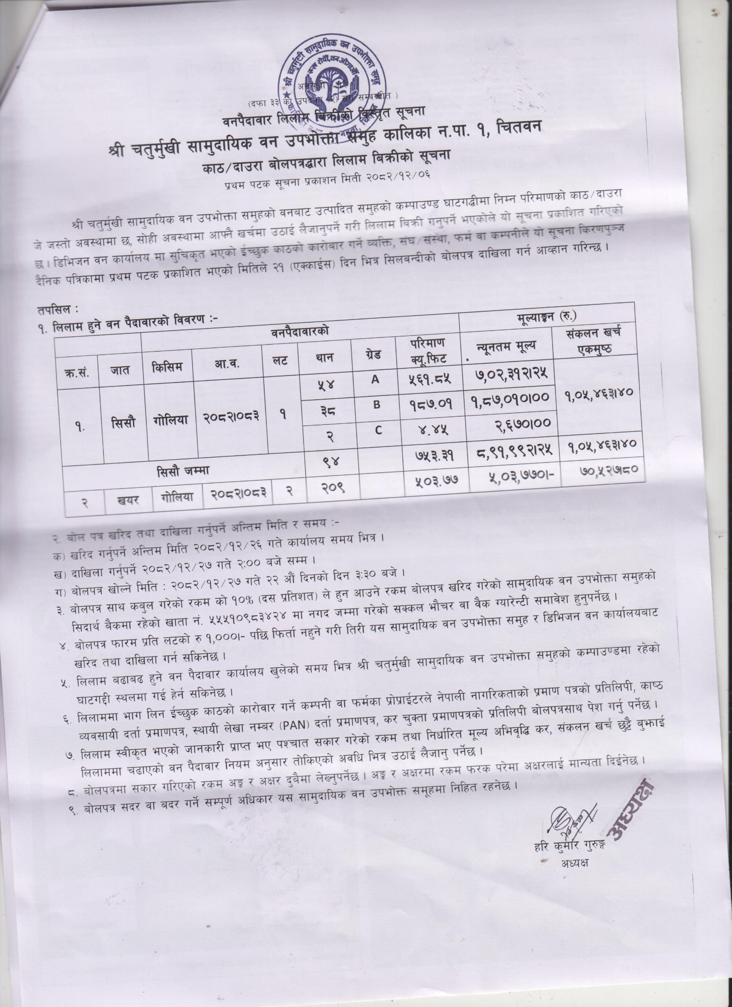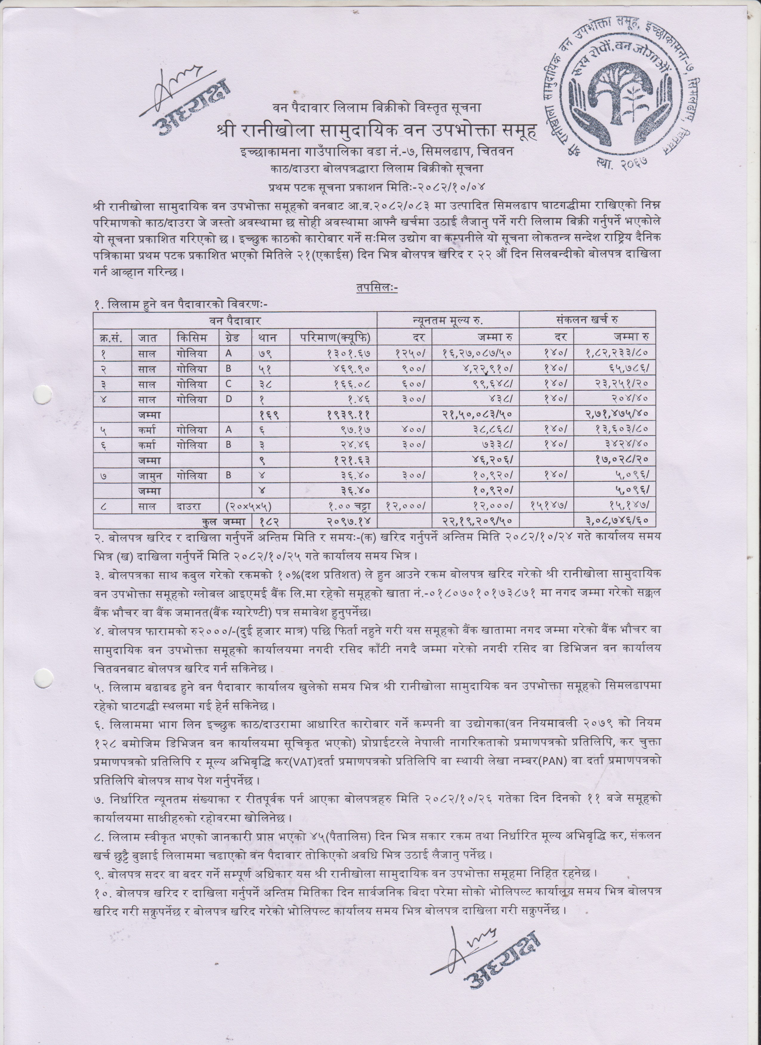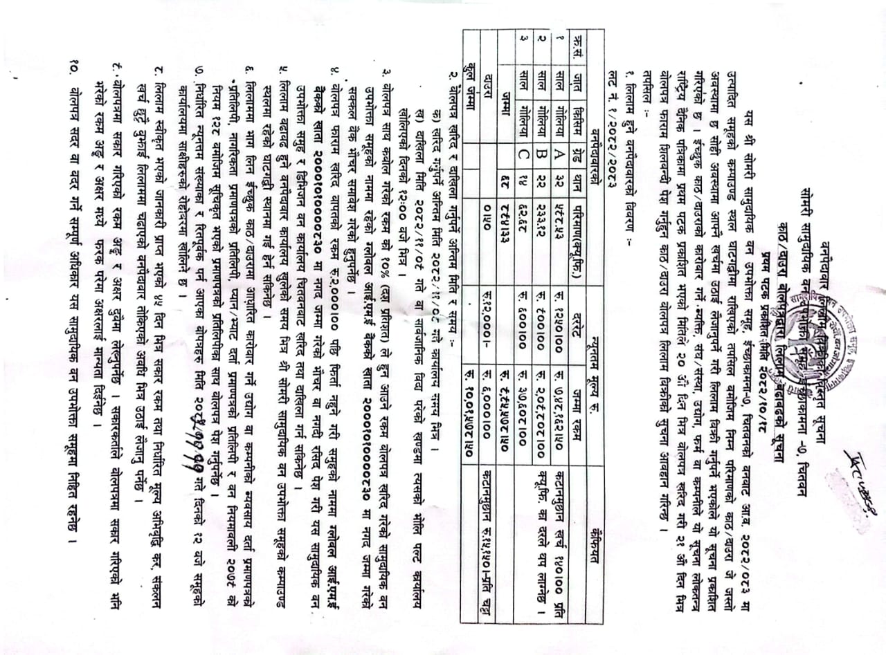 २०८२-१२-०६ चतुर्मुखी सामुदायिक वनको काठ दाउरा लिलाम बिक्री सूचना