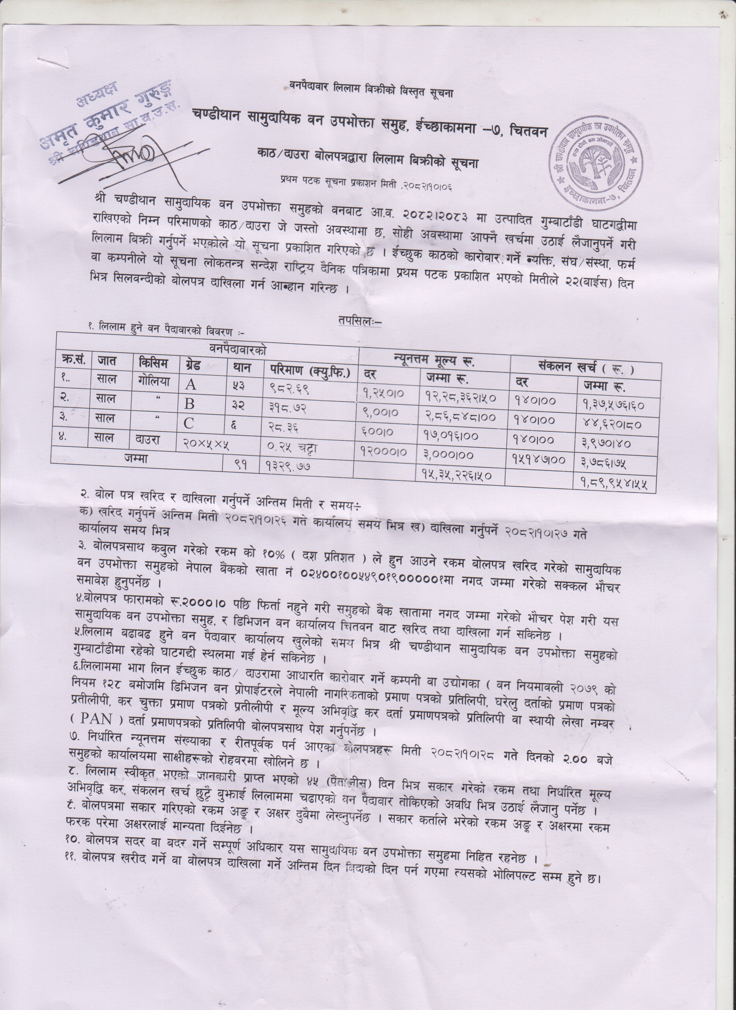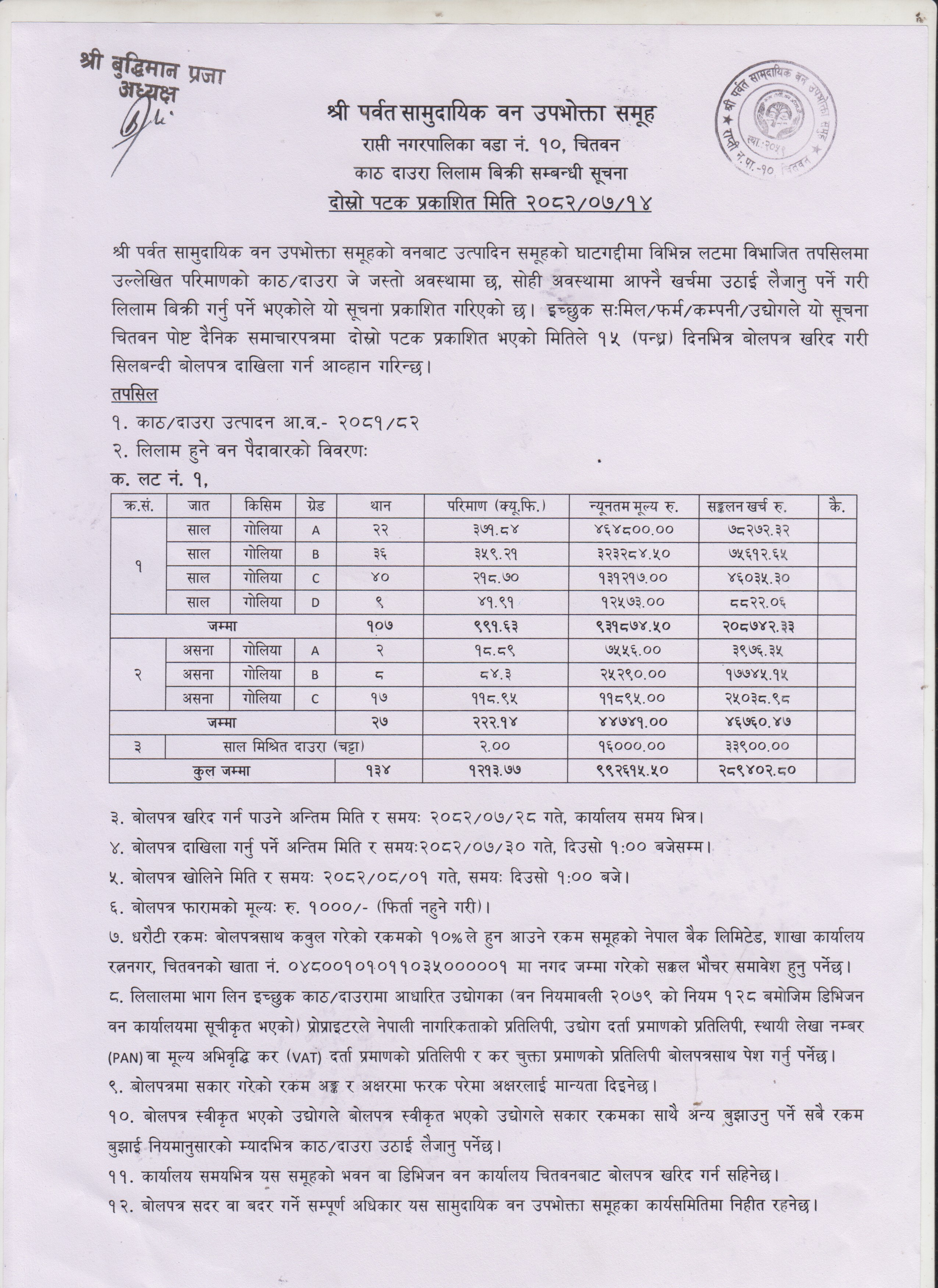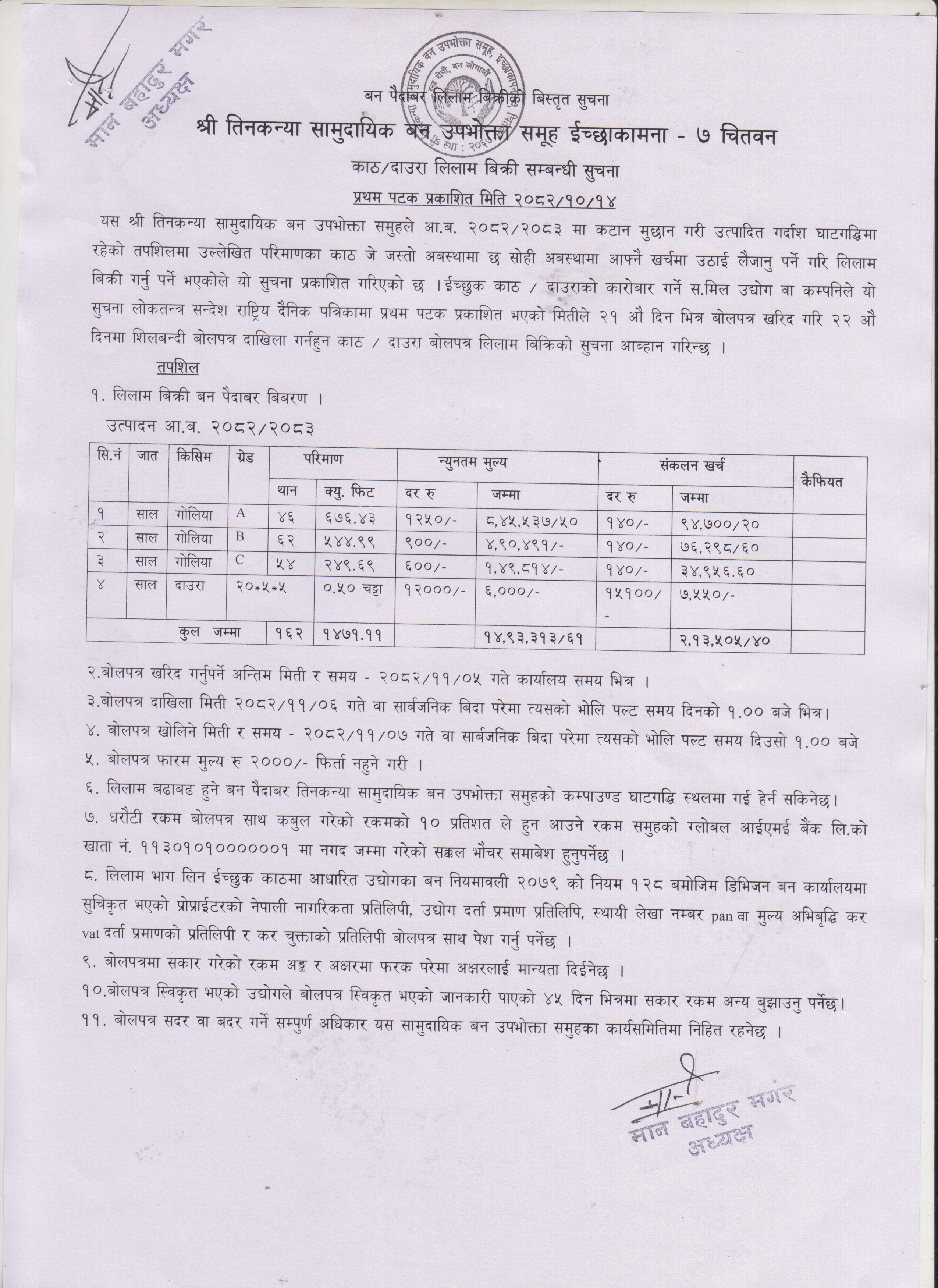 २०८२-१२-०६ चतुर्मुखी सामुदायिक वनको काठ दाउरा लिलाम बिक्री सूचना