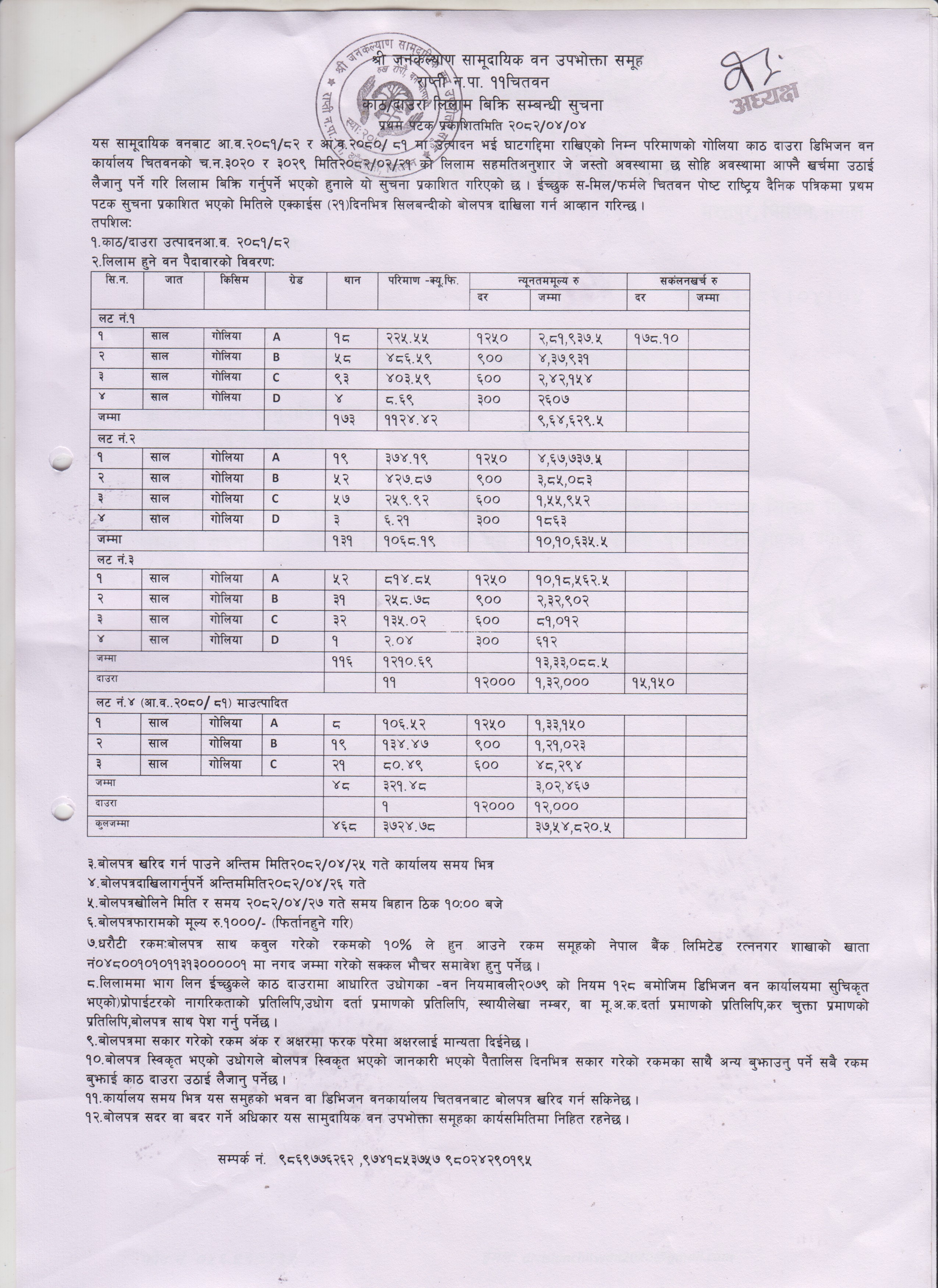 २०८२-०५-०१ मंगलादेवी सा.व.उ.स., कालिका न.पा.-८ को काठ/दाउरा लिलाम बिक्री सूचना
