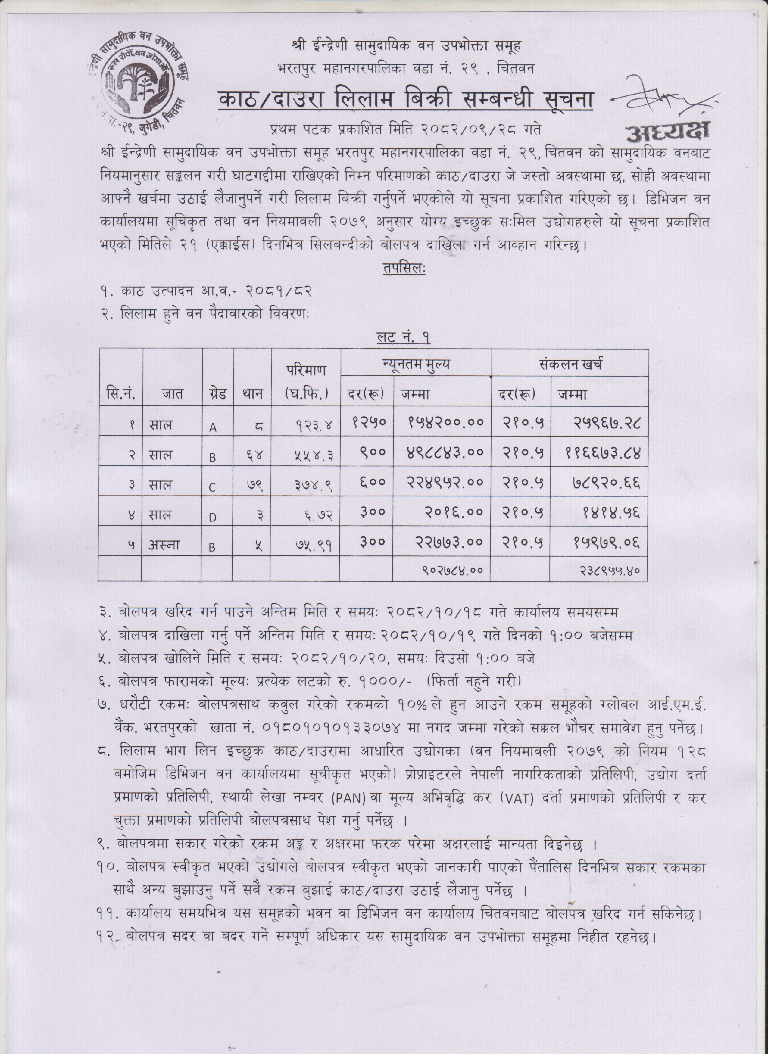 २०८२-०९-२८ इन्द्रेणी सा.व.उ.स., भरतपुर-२९ को काठ लिलाम बिक्री सूचना