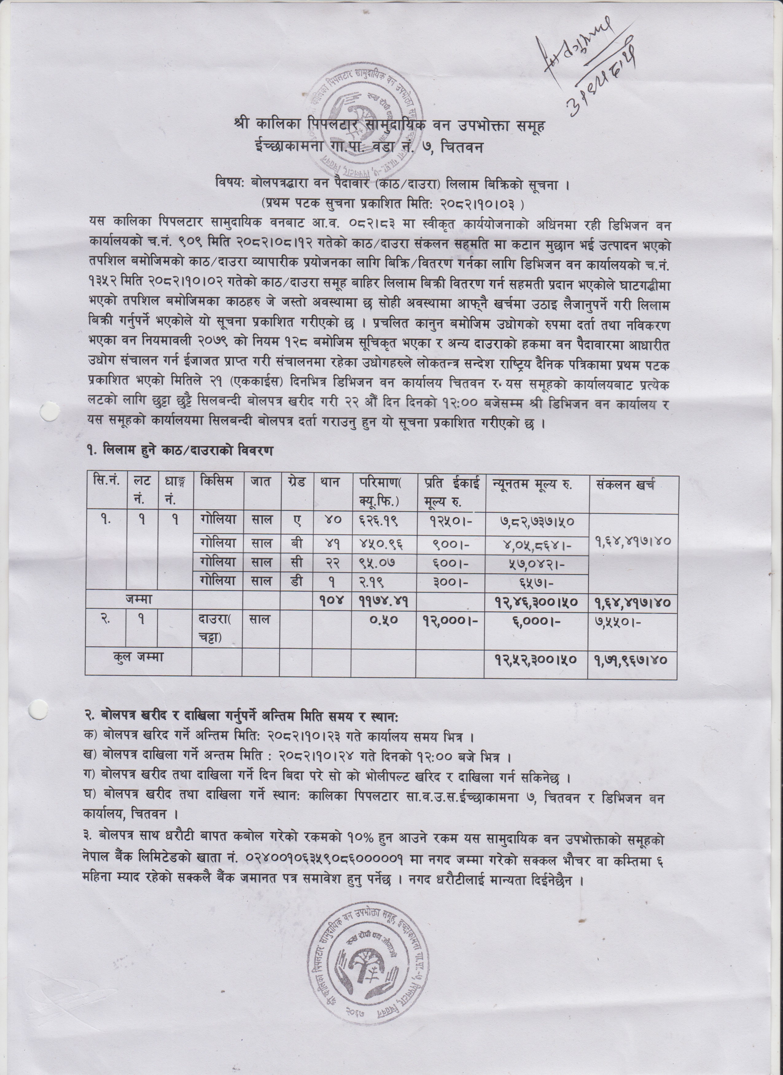 २०८२-१०-०३ कालिका पिपलटार सा.व.उ.स., इच्छकामना-७ को काठ/दाउरा लिलाम बिक्री सूचना